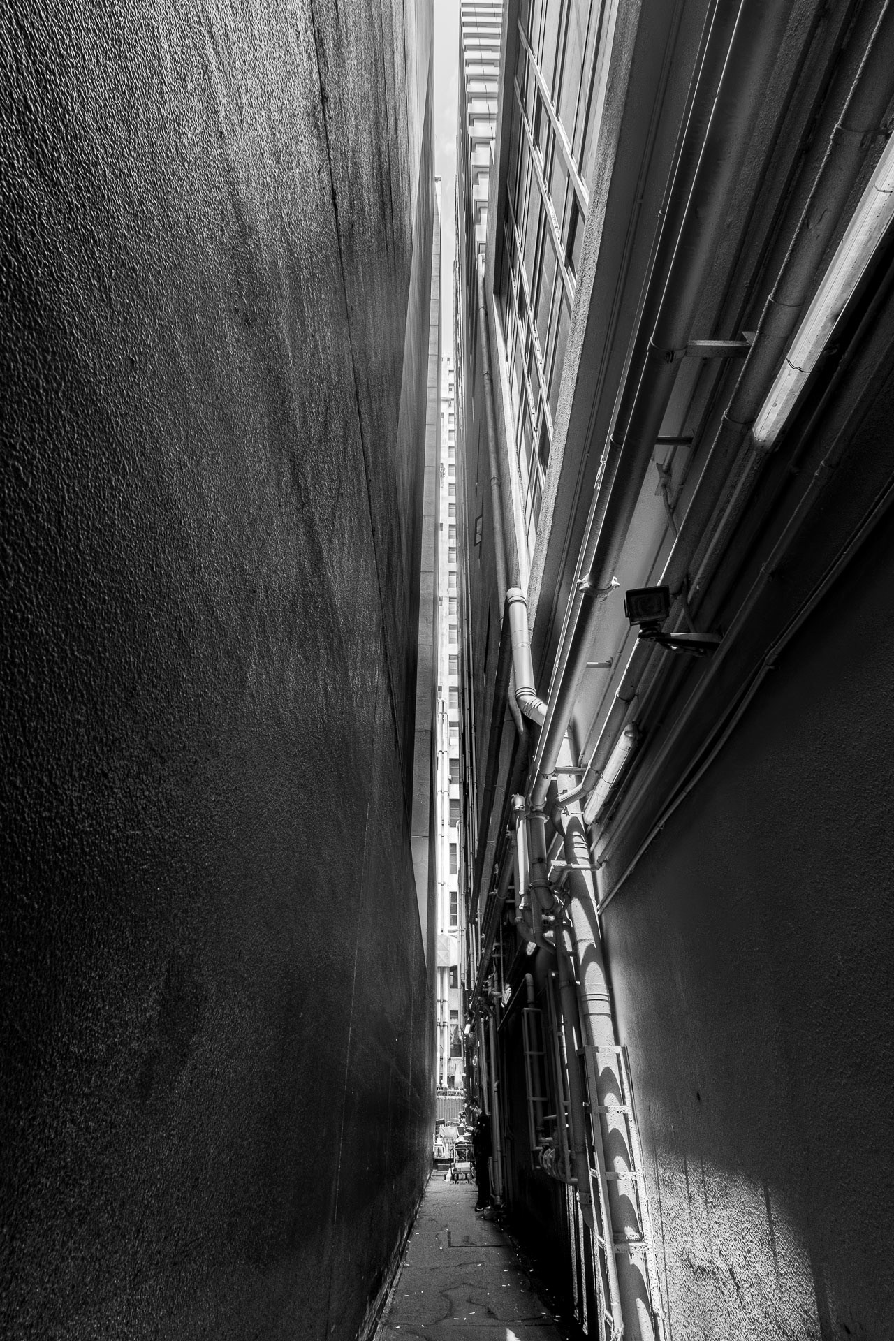 The photographs are divided into two sessions: "Day" and "Night". During the day, black and white photography emphasizes the alleys' characteristic elements, i.e., the geometrical shapes and the structures of the buildings, and the outlines of objects. At night, color images reinforce the sense of alienation and muted mood induced by street lamps, billboards, neon signs, and people arriving and leaving. Debris, pipes, scaffolding, and heat and smoke vented from air conditioners and extractor fans collectively reveal the functional equipment of the city.