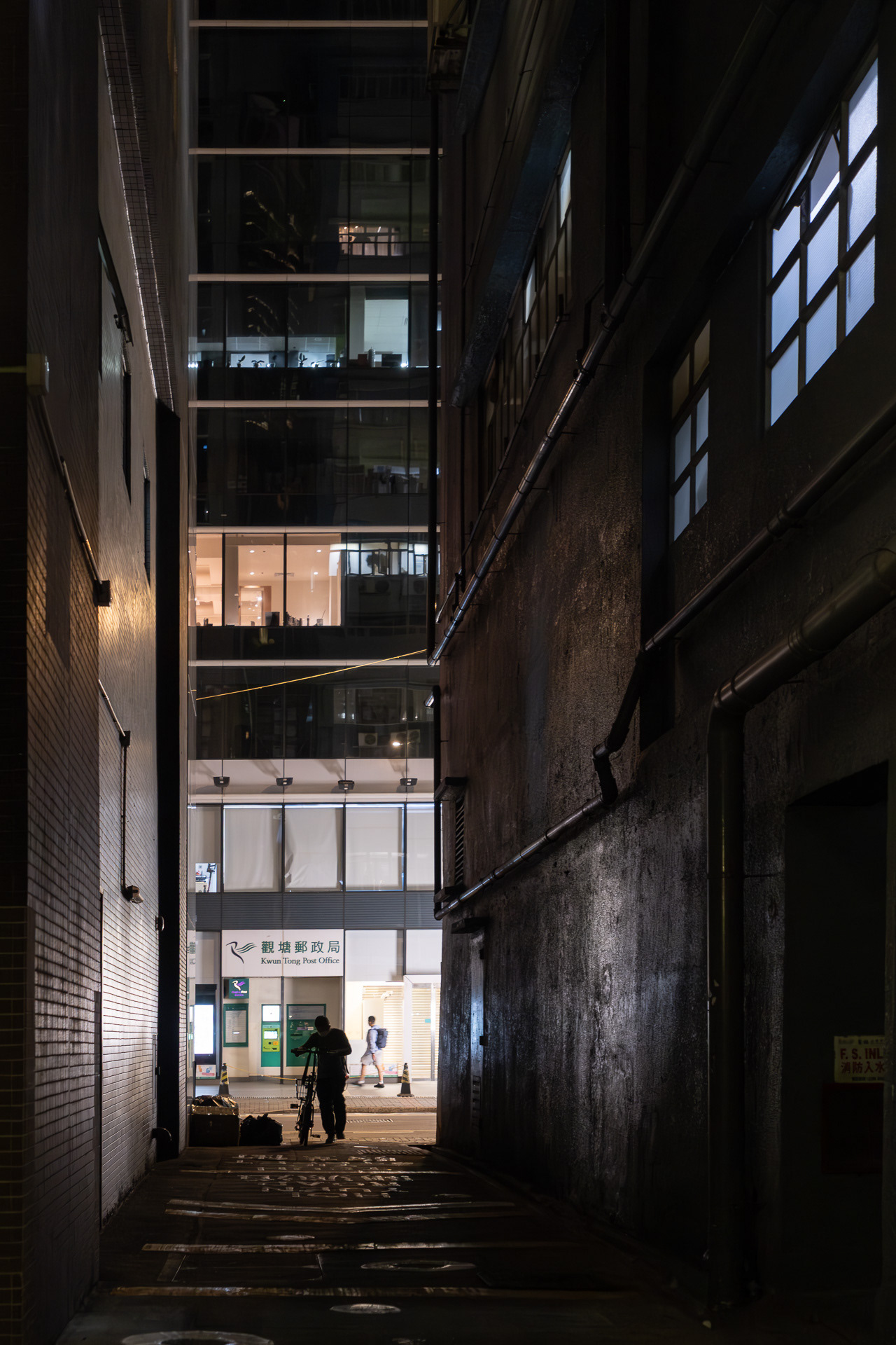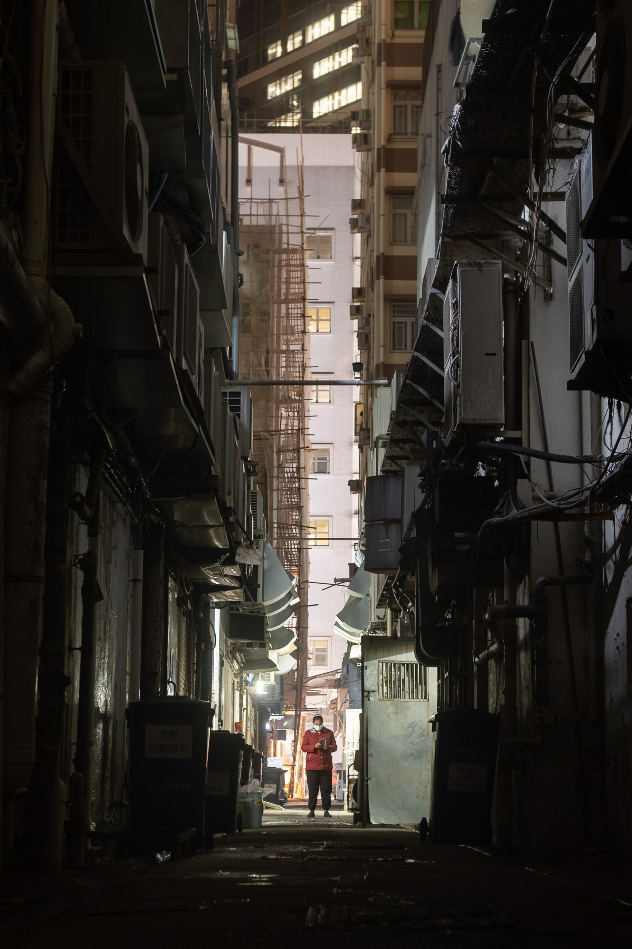 The photographs are divided into two sessions: "Day" and "Night". During the day, black and white photography emphasizes the alleys' characteristic elements, i.e., the geometrical shapes and the structures of the buildings, and the outlines of objects. At night, color images reinforce the sense of alienation and muted mood induced by street lamps, billboards, neon signs, and people arriving and leaving. Debris, pipes, scaffolding, and heat and smoke vented from air conditioners and extractor fans collectively reveal the functional equipment of the city.