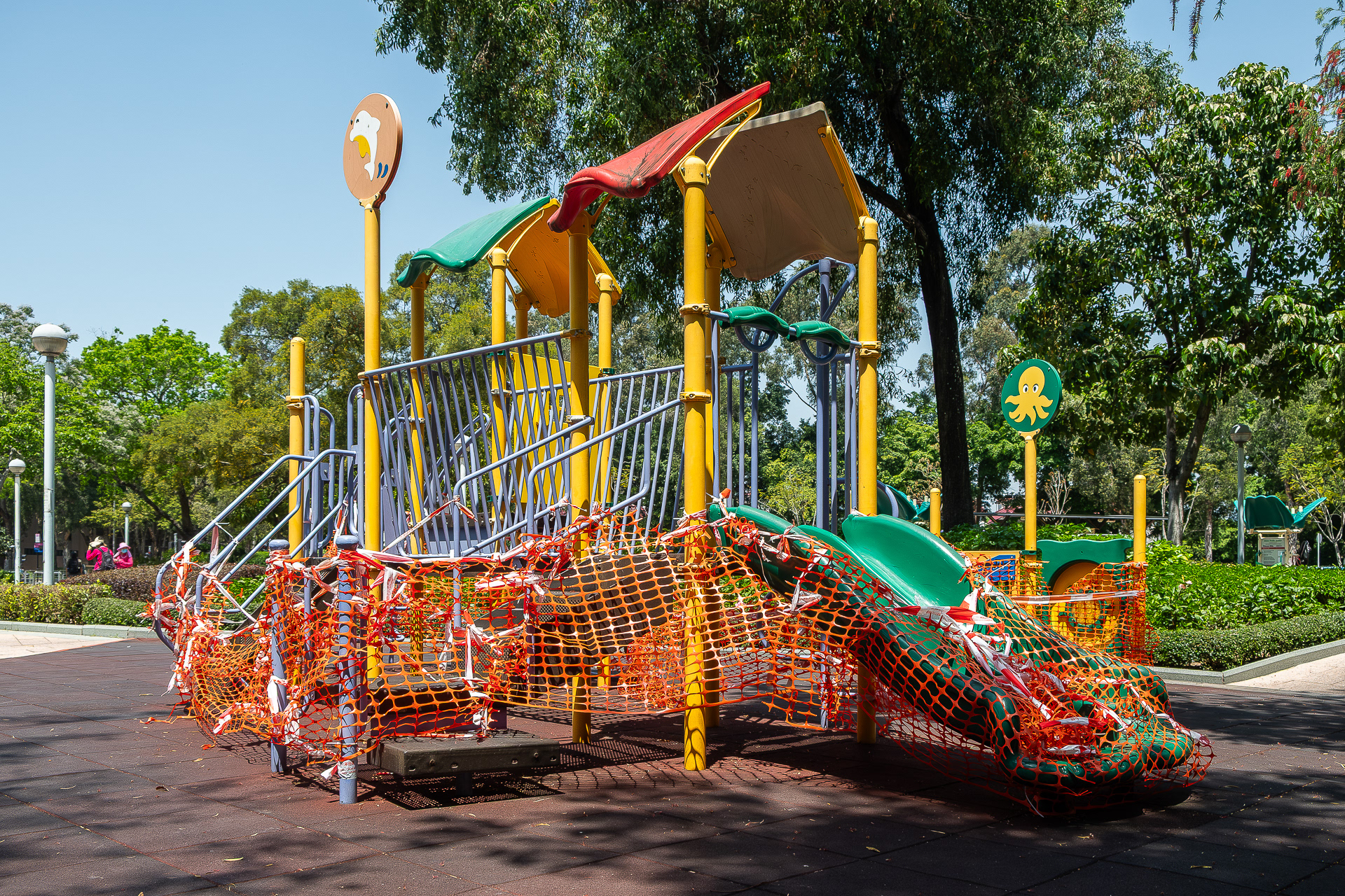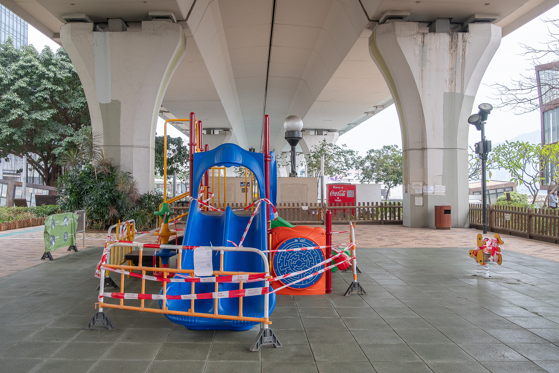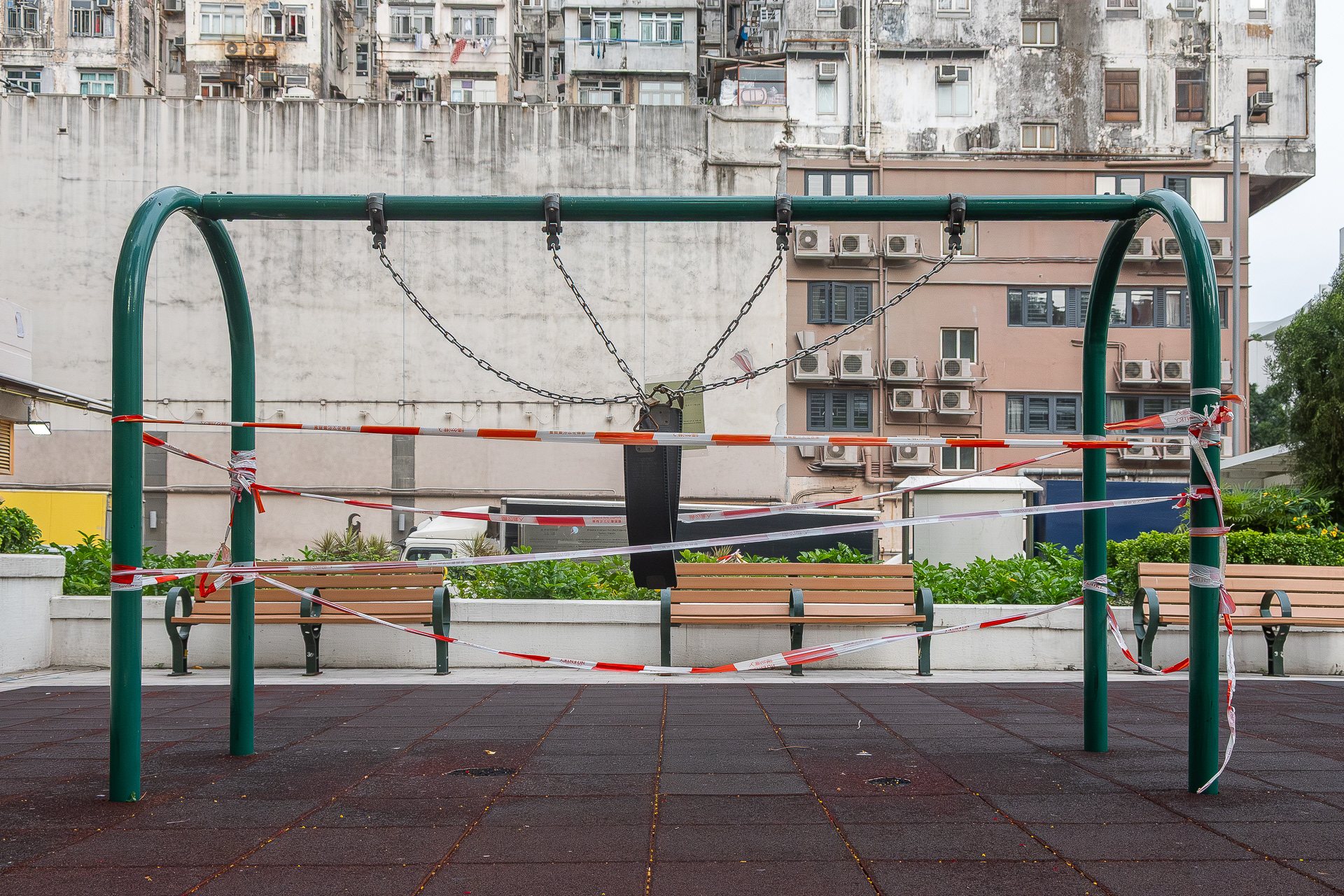 作品聚焦於被紅色封鎖條帶徹底封鎖的社區設施。扭曲纏繞的條帶是一種強力的禁止符號。而本應歡樂的空間被沉重靜默所取代。這些照片不僅是對一個特殊時期的記錄,而是關注人類社會活動突然停止的狀態。