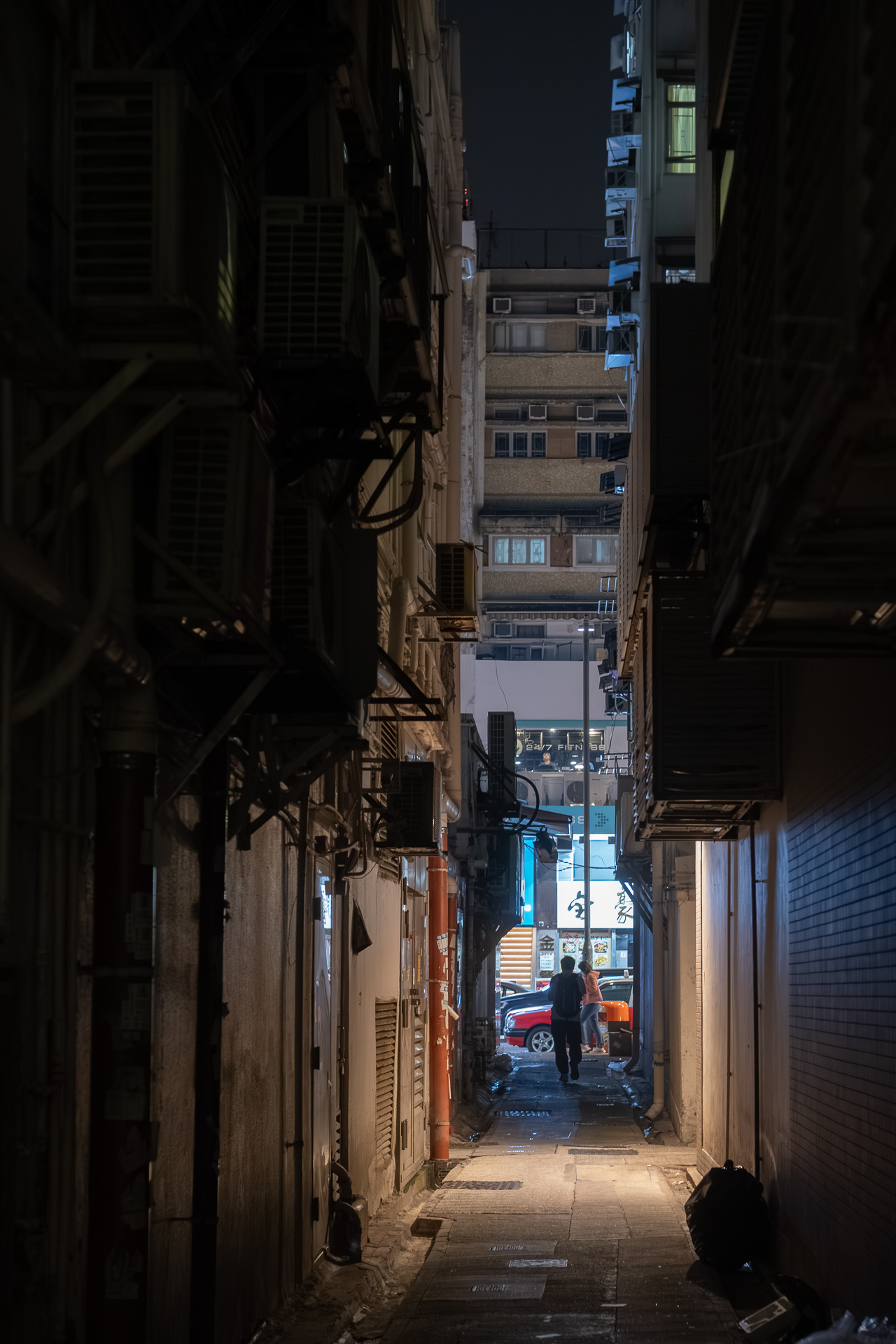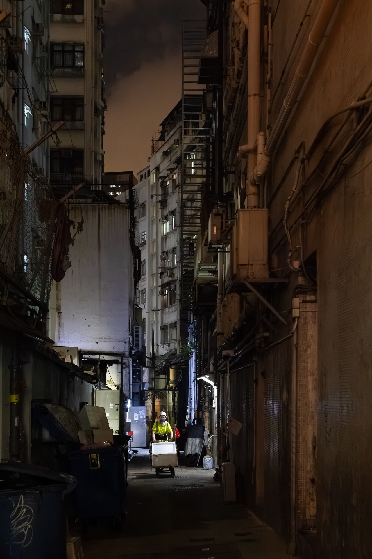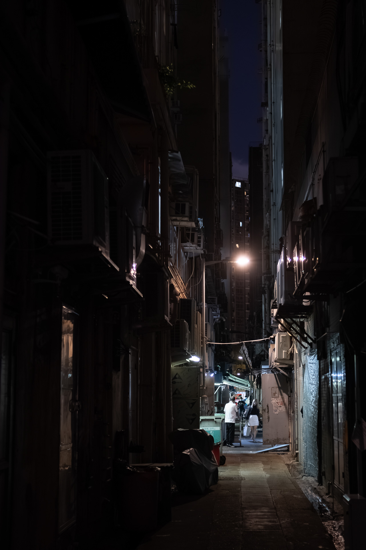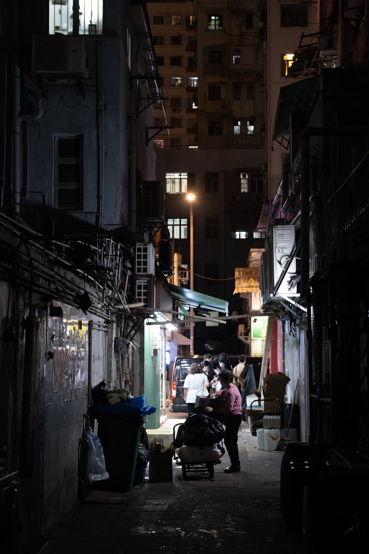 我採用類型學(typology)的方法,通過垂直構圖系統地記錄香港城市中常被忽略的「狹縫」— 後巷。這些照片分為「白天」與「夜晚」兩個時段。在日間,黑白攝影強調了後巷由建築物的幾何形狀、結構和物體輪廓所形成的特徵。而在夜晚,彩色照片則突顯了街燈、招牌、霓虹燈以及出入行人的存在所帶來的疏離感和靜謐氛圍。後巷中的雜物、水管、棚架,以及從冷氣機和抽風扇散發出的熱氣和廢氣,共同展現出城市運作的一面。