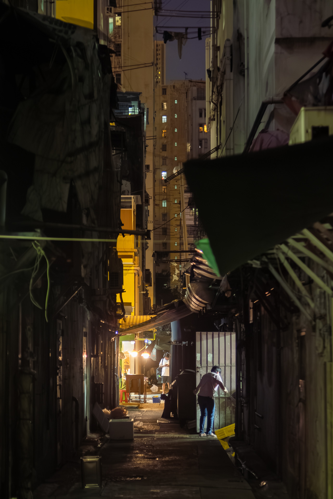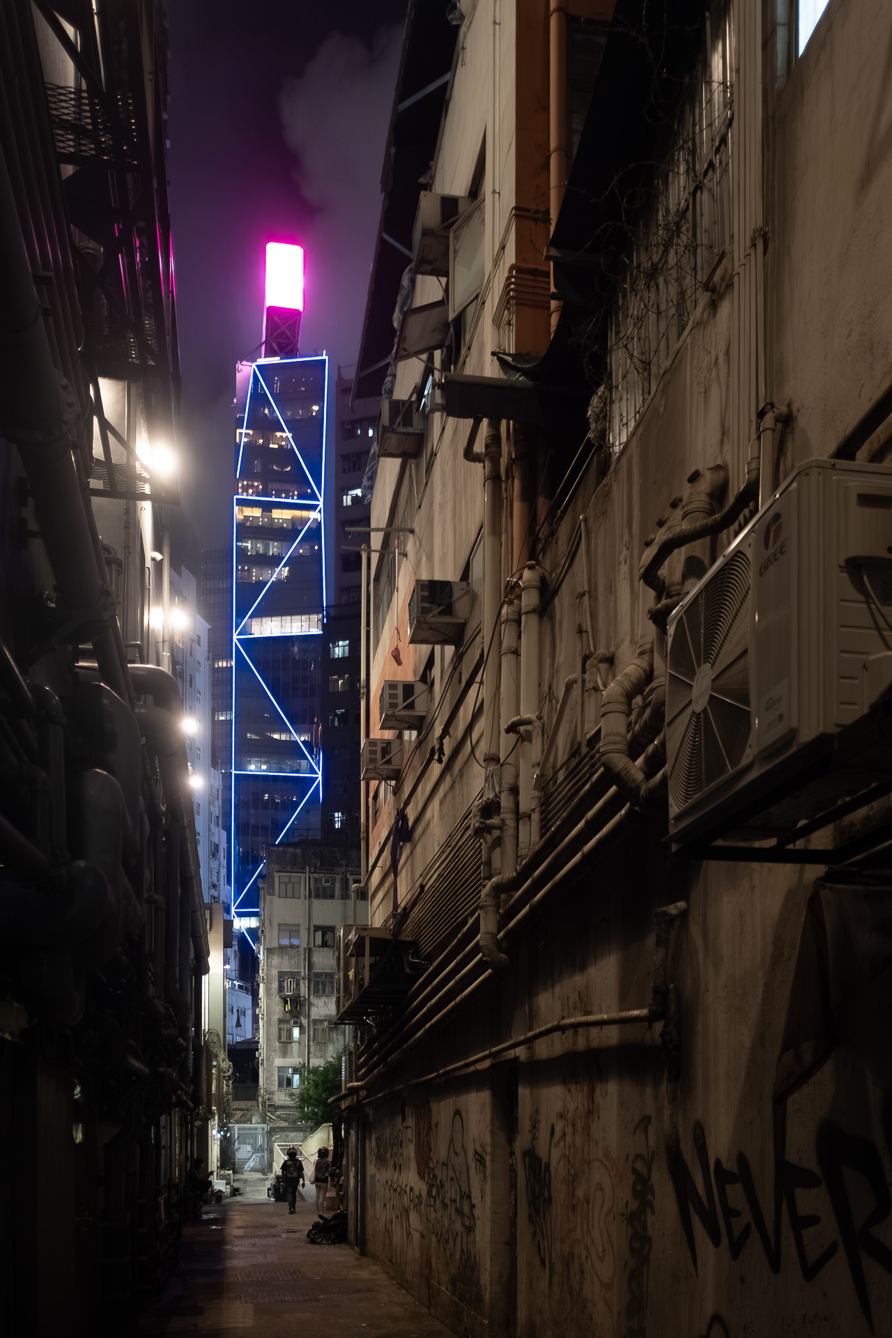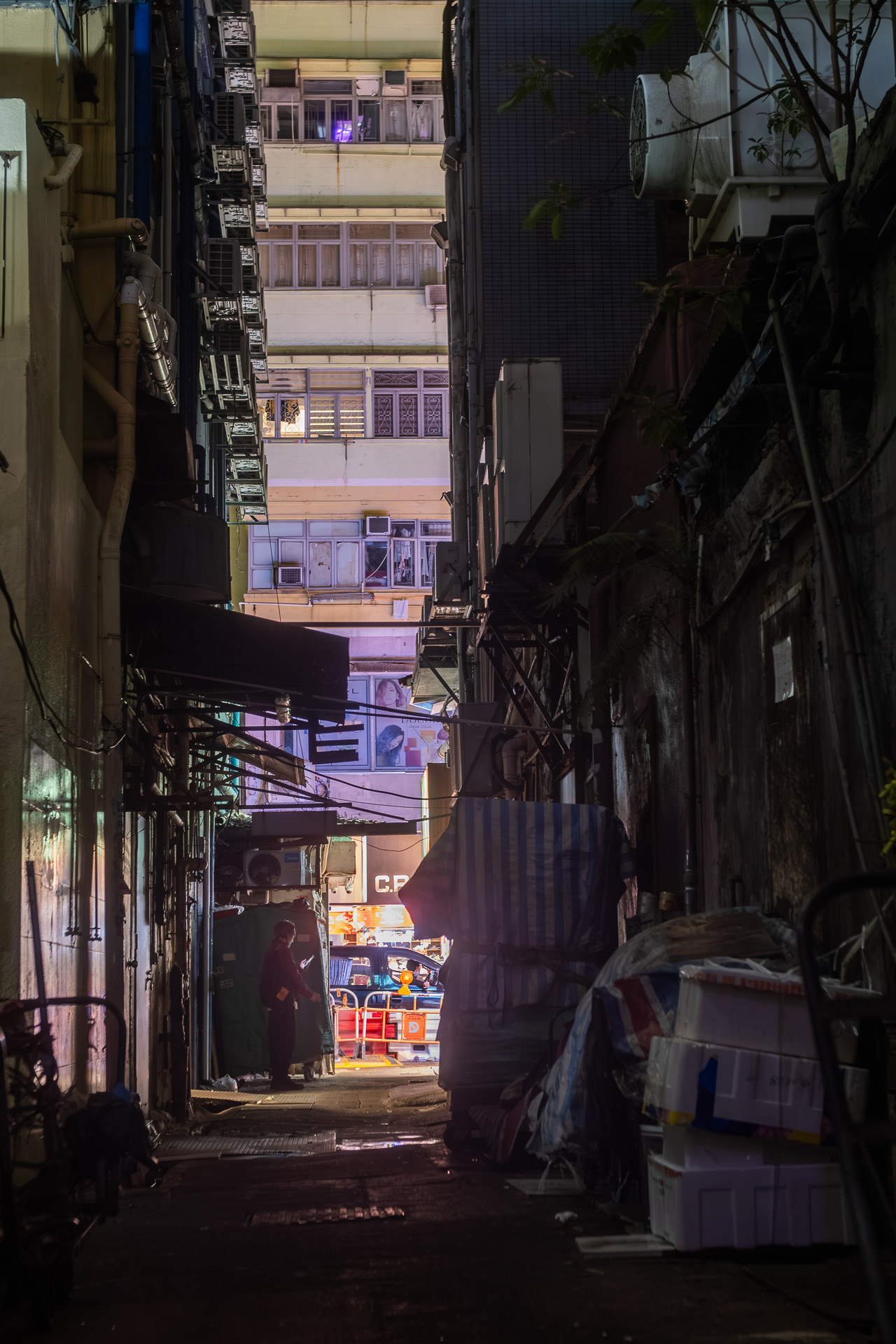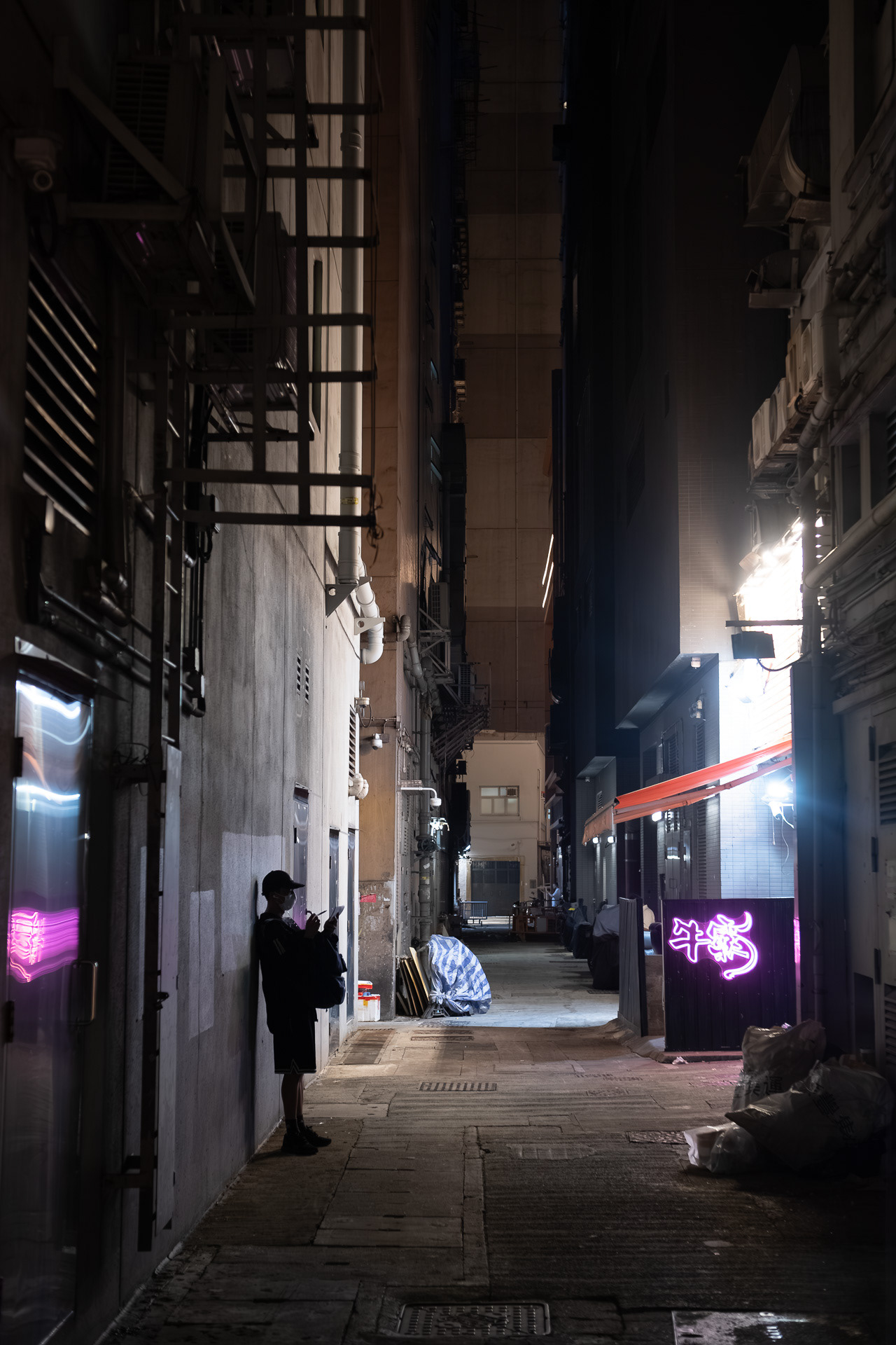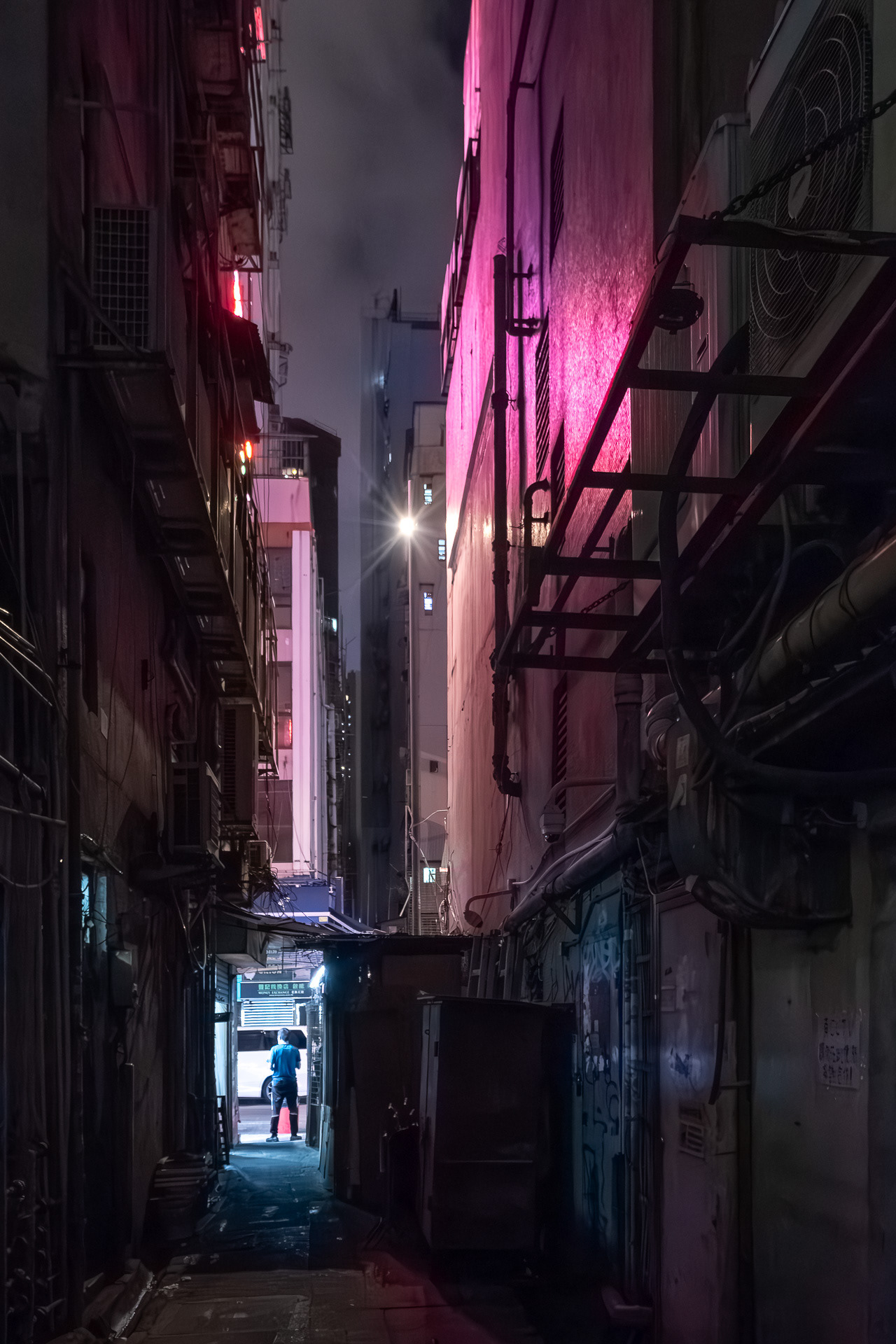 我採用類型學(typology)的方法,通過垂直構圖系統地記錄香港城市中常被忽略的「狹縫」— 後巷。這些照片分為「白天」與「夜晚」兩個時段。在日間,黑白攝影強調了後巷由建築物的幾何形狀、結構和物體輪廓所形成的特徵。而在夜晚,彩色照片則突顯了街燈、招牌、霓虹燈以及出入行人的存在所帶來的疏離感和靜謐氛圍。後巷中的雜物、水管、棚架,以及從冷氣機和抽風扇散發出的熱氣和廢氣,共同展現出城市運作的一面。