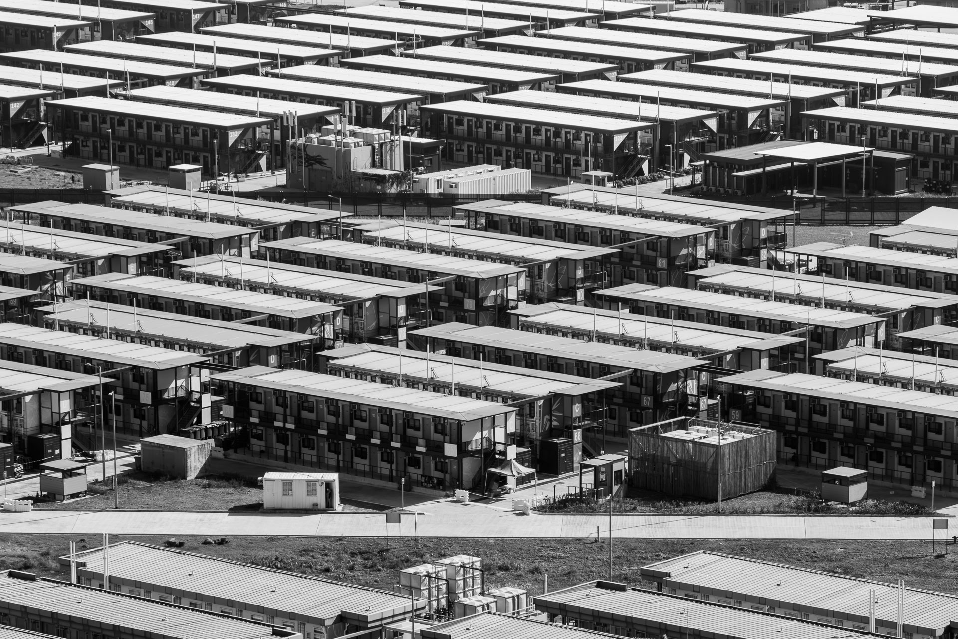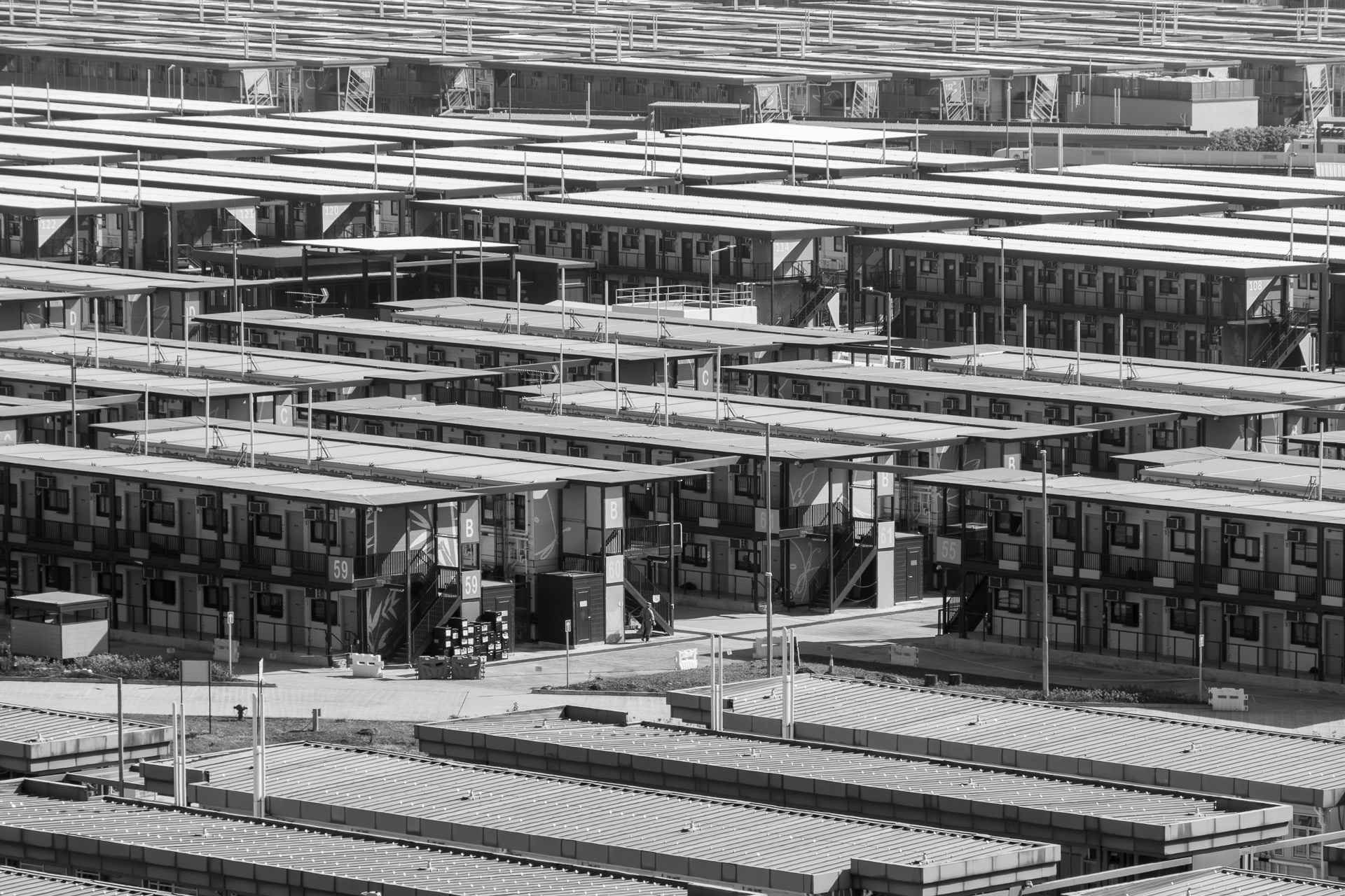 我使用「新地形學」(New Topographics)的方法,利用黑白攝影來描述一種被精確控制但無人使用的景觀。照片著眼於隔離中心外圍的圍欄、閘門和緩衝區。這些外圍元素蘊含著當時「封閉」和「隔離」的感覺。在俯瞰角度下,設施呈現嚴謹的幾何布局、通道的分區與高效的規劃,顯示出它們為應對疫情而設計。